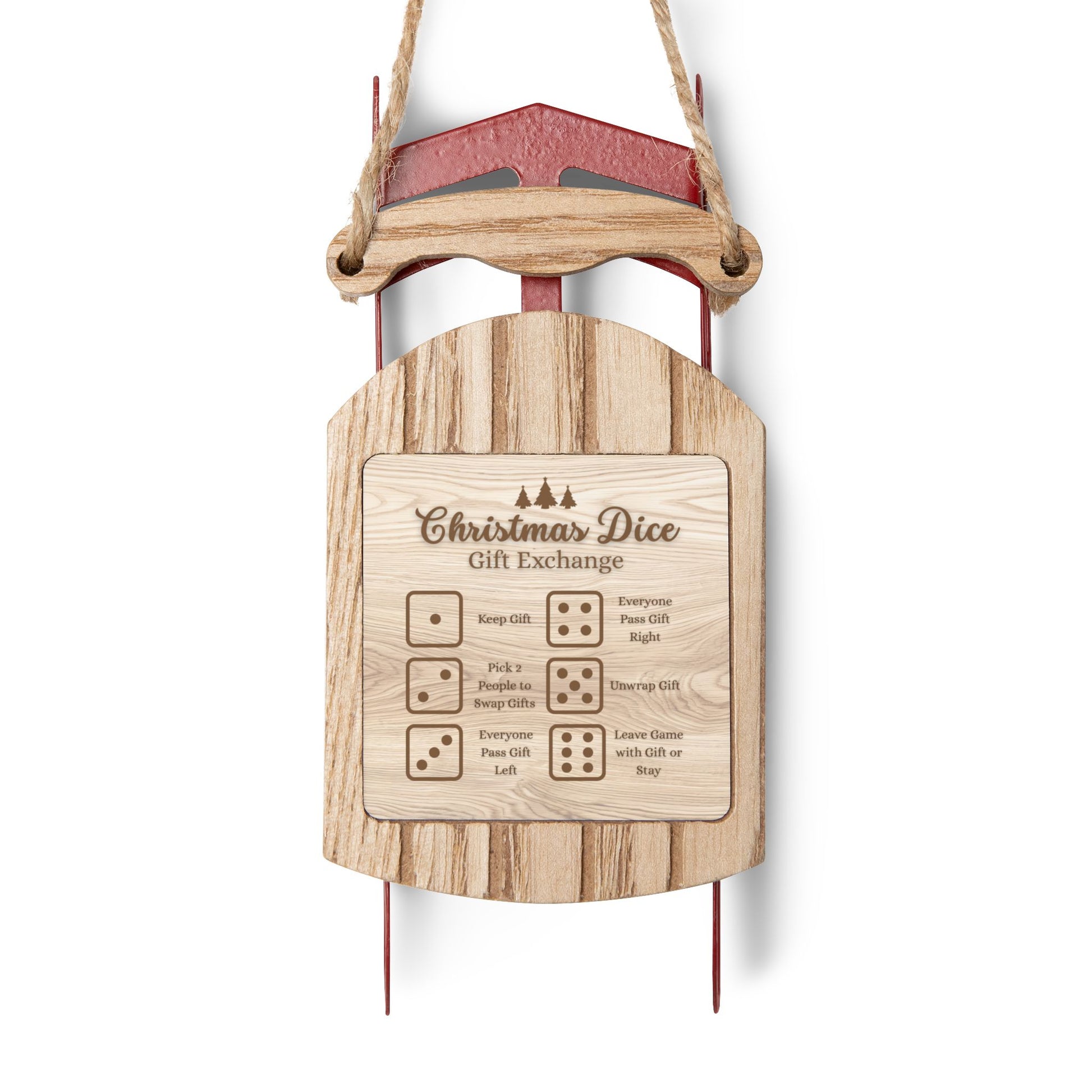Make your holiday gatherings extra merry with our Dice Game Sled Christmas Ornament! Crafted from durable MDF and galvanized steel, this festive sled-shaped ornament doubles as a fun Christmas dice game everyone will love. It’s the perfect addition to your tree or a thoughtful gift for family and friends to enjoy year after year. Each ornament comes with a twine hanger for easy display and a touch of rustic holiday charm.