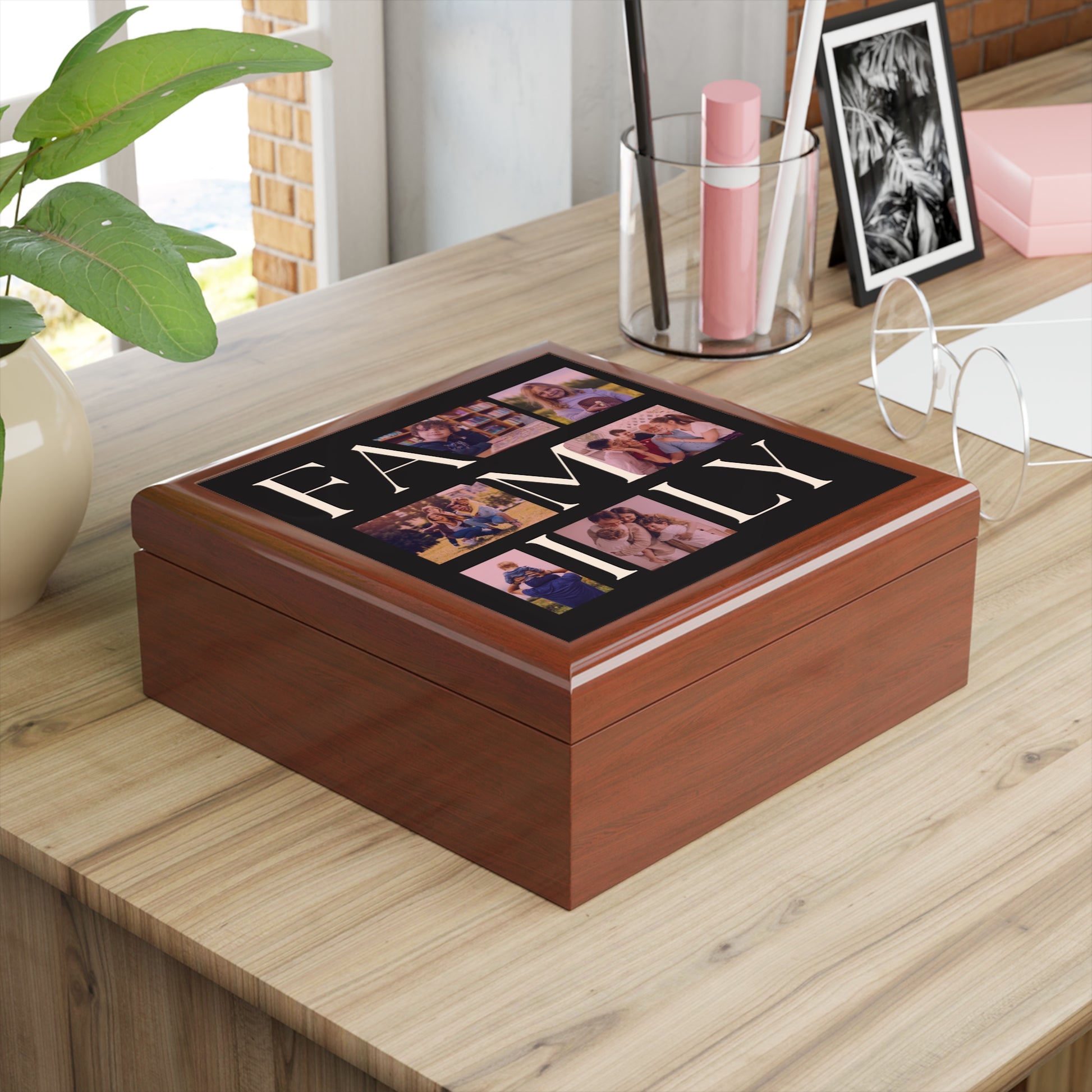 Celebrate the people who matter most with our Family Collage Photo Keepsake Jewelry Box, featuring multiple cherished photos arranged with a meaningful title or phrase. This beautifully crafted wooden box is perfect for storing jewelry, heirlooms, or sentimental treasures while proudly displaying your favorite family moments. Ideal for Mother’s Day, birthdays, memorials, or heartfelt gifts, it blends personalization with elegance. A touching keepsake designed to honor love, memories, and the special bond of family for years to come.