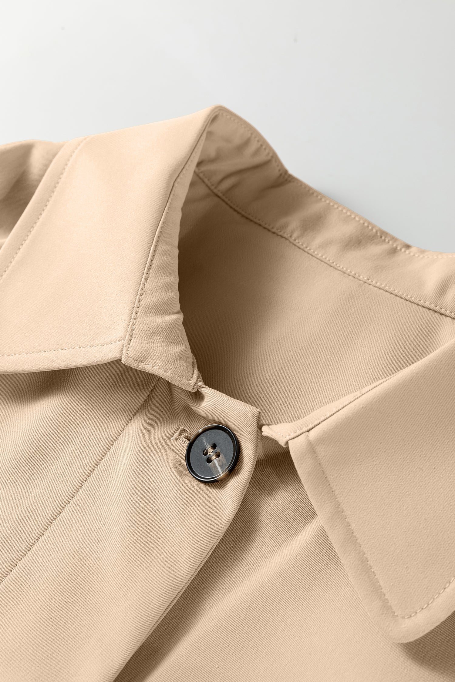 Effortlessly classic with a modern twist, this jacket is your new go-to for polished everyday style. Designed with a relaxed, easygoing fit, it flatters every body shape while offering that timeless trench-inspired look. The soft lapel collar and single-breasted front keep things clean and chic, while the plaid lining adds the perfect pop of personality, especially when the sleeves are cuffed. Finished with two convenient side pockets and crafted for all-day comfort, this piece pairs beautifully with everything from denim to workwear staples.