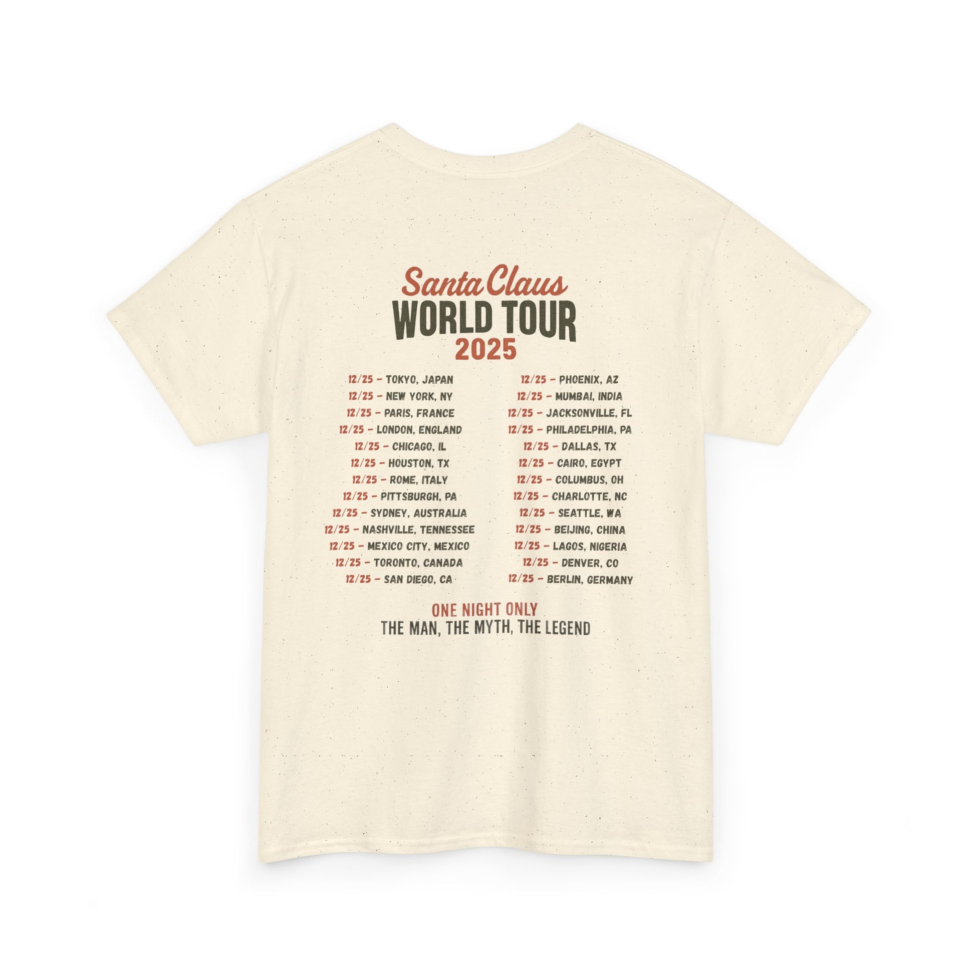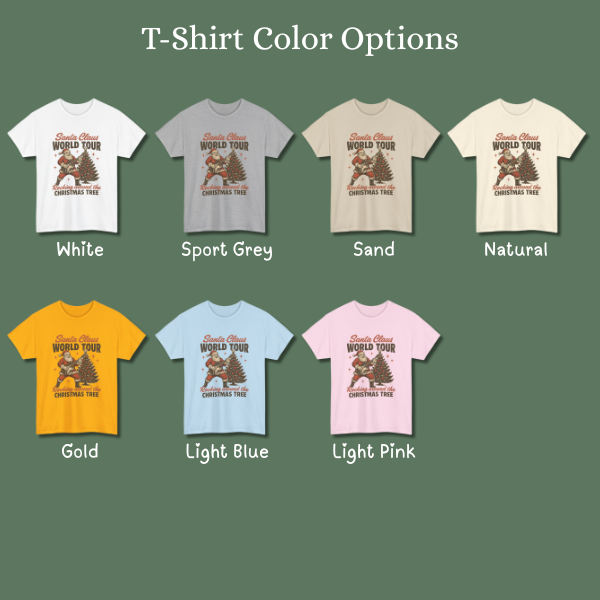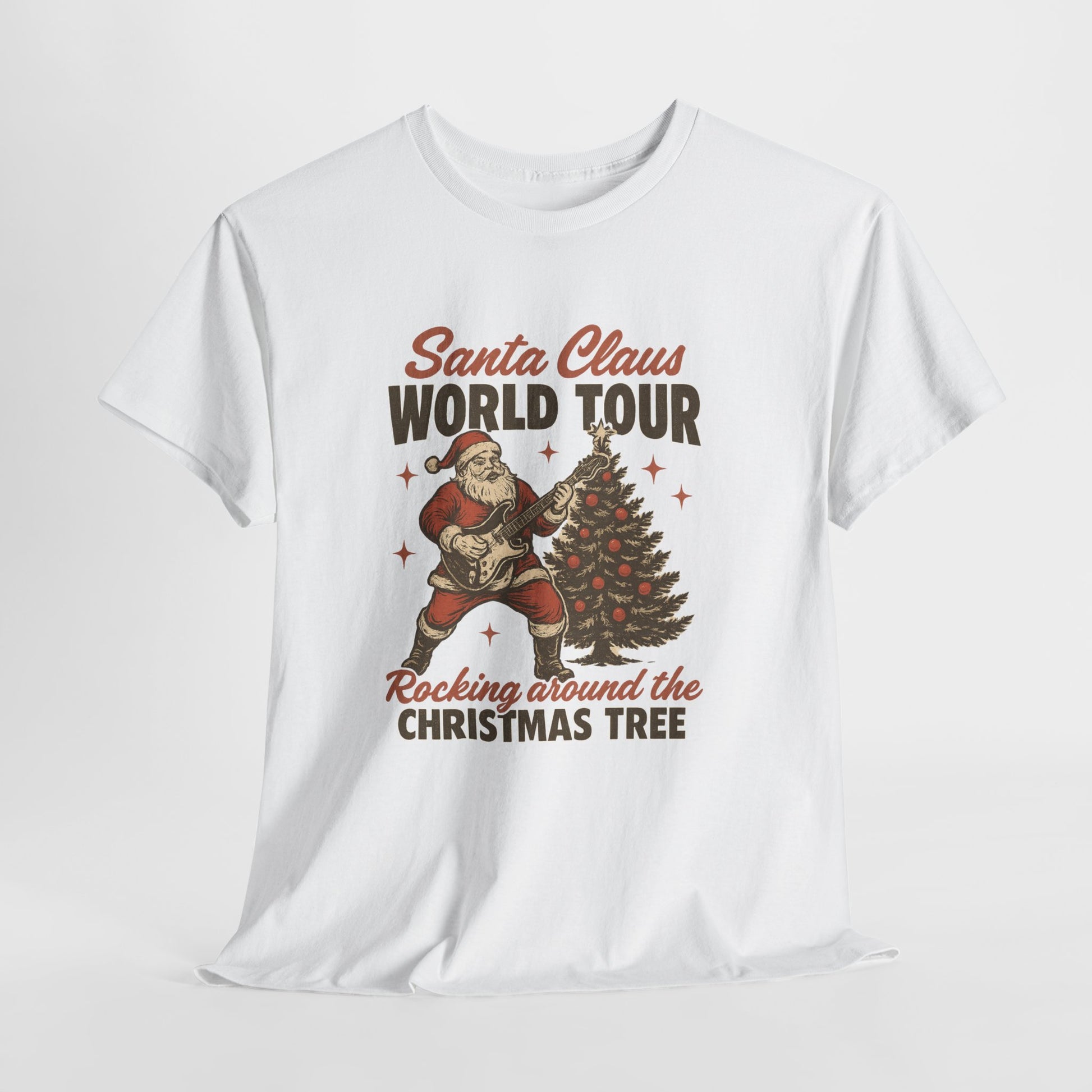 Rock around the Christmas tree in style with our Santa Claus World Tour Graphic Tee! Featuring a retro-inspired design of Santa shredding on guitar, this festive favorite is printed on the classic Gildan 5000 heavy cotton tee for lasting comfort and color. Made from 100% ethically sourced cotton, it’s soft, durable, and perfect for spreading holiday cheer all season long. Available in White, Sport Grey, Sand, Natural, Gold, Light Blue, and Light Pink. Note: White may appear slightly off-white due to fabric properties.